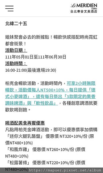 艾美寒舍大廳的北緯25與帕金碑酒合作推出暢飲優惠方案。