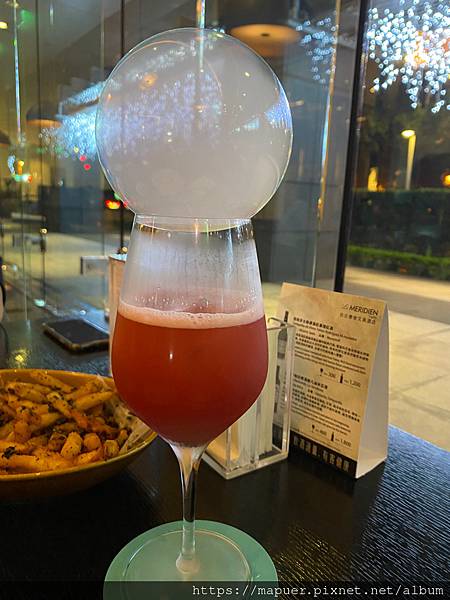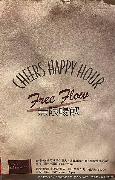 最近兩次拜訪台北君悅酒店的Cheers-歡飲廊都是使用雙人暢飲券,雖說調酒是以 Gin Rum Vodka Tequila Whiskey 等單一基酒 所調製的最基本款調酒為主,但變化出來的選擇也算不少,且以雙人券的價位、還附贈一份綜合炸物盤,5星飯店的用餐環境,應對有一定水平的服務人員,我覺得CP值蠻高的。