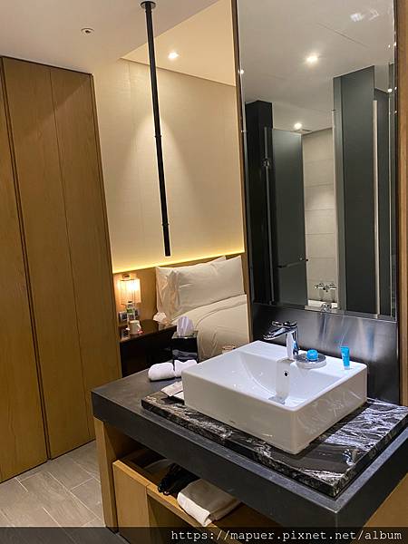 門板的後頭就是洗手台,對出門住宿免不了平平罐罐的女人來說,這平台著實小了些,隨便擺放就顯得房間凌亂,另外夜寢時翻個身就看到浴室或廁所門,不知怎麼形容這不舒服的感受。