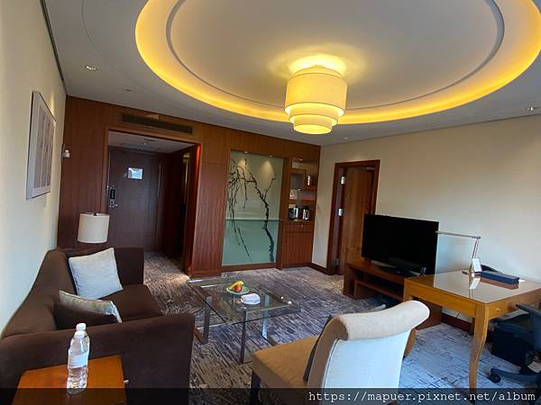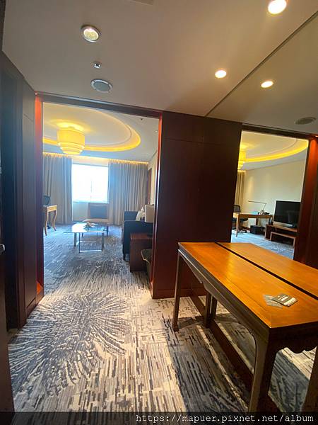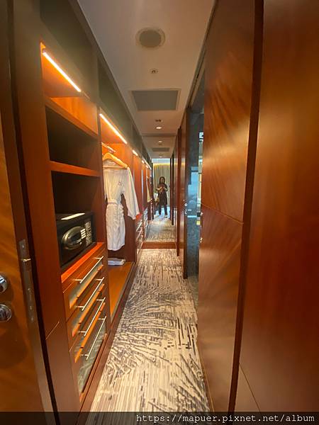 套房位置在每層樓近電梯位子,蠻訝異的窗外面對側邊巷弄而非忠孝東路主幹道,所以視野確實比一般房還差些,但格間、20坪的空間當然是較其他房型大許多,分開的臥室與客廳區,獨立的中國風客廳、入口處有一半套洗手間,因為舊型旅館雙人房僅有一洗手台,剛好可以利用客廳外的洗手間,套房的床型也是有分兩單人床或一大床,這些年的經驗雙人床愈來愈難求,也就習慣定一大床,喜來登酒店的雙人床為加大型(220x210cm) 相當寬敞舒適,加上已熟門熟路的知道請飯店準備兩床棉被,就更不會受到干擾了,臥室的剩餘空間也相對較多較舒適 , 臥室連著走道衣櫃區自然形成一獨立換衣空間,直接面對浴室。下回幸運入住不知待何時? 就先用照片記錄下吧